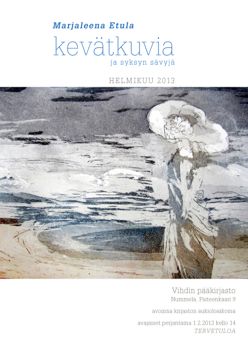 Minulla on ilo pitää jo toisen kerran taidenäyttely Vihdin pääkirjastossa Nummelassa. Ehkä henkilökohtaisella kirjastovirkailijallani ja hyvällä ystävälläni Liillä on jotain tekemistä asian kanssa. Viime tammikuussa hän muistutti, että kirjastossa on vuoden jono näyttelyille. Minä otin rohkeasti yhteyttä päättäjiin ja sain paluupostissa vastauksen – tervetuloa helmikuussa 2013. Ajattelin, että sepä on kaukana tulevaisuudessa.