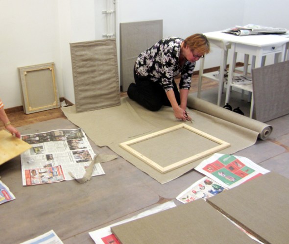 Iltapäivällä Hilja opasti meitä taiteilijalaatuisten öljyväripohjien tekoon. Aloitimme kokoamalla kiilakehytkset ja kiinnittämällä niihin niittipyssyllä pellavakankaan. Opimme että niitit ammutaan kehyksen sisäpuolelta noin viiden sentin välein kiilapuun suuntaisesti. Kulmien teko oli oma taiteenlajinsa. Tyyli oli vapaa kunhan lopputulos oli siisti eikä pullistellut.
