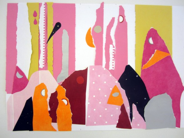 Eila jatkoi kanssamme iltapäivällä. Hän jakoi kaikille erivärisiä papereita, joista saimme leikata ja liimata kollaaseja oman maun mukaan. Ainoa edellytys oli, että käytämme vain väripintoja ja kiinnitämme huomiota sommitteluun. Tehtävä oli hauska. Kaikki irrottelivat siinä määrin, että päivän päätteeksi Eila kehui meitä idearikkaiksi ja taitaviksi. Eila ei kehu, ellei ole aihetta.