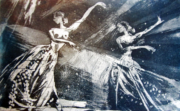 Helmikuussa Helsingin Sanomissa oli hurmaava kuva kansallisbaletin uutuuskoosteesta Bella Figura. Kuva inspiroi minua siinä määrin, että siitä oli pakko tehdä oma versio. Aloitin laatan teon grafiikkakurssilla verkatehtaalla ja jatkoin sitä grafiikkapajalla Poltinaholla. Koevedos kertoi, että liike on hallussa.
