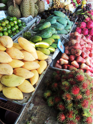 Tulimme eilen jo päivällä ja majoituimme pieneen hotelliin aivan sataman tuntumaan. Iloinen yllätys oli tilava parveke, josta oli illalla upea näkymä auringonlaskun suuntaan. Päivä vierähti hikisillä kaduilla ja mukavasti ilmastoiduissa kauppapuodeissa tuliaisostosten merkeissä. Ostimme lisää matkalukemista kirjakaupasta, kookosöljyä tavaratalosta, käsintehtyä paperia paperikaupasta ja currytahnoja Tescosta.