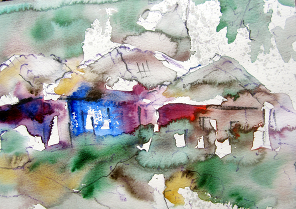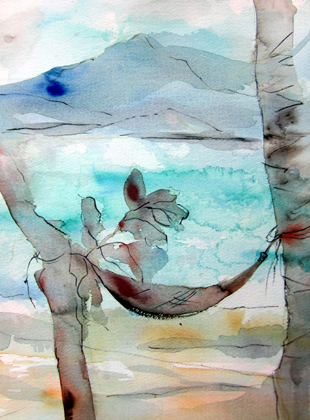 Palattuamme pääsin vihdoin maalaamiseen alkuun. Omalla verannallamme lankoihin pujotellut simpukat ja korallit helisevät tuulessa. Meren maalaaminen ei ole mitenkään helppoa, mutta värikkäät puutarhamökit innostivat heleydellään.