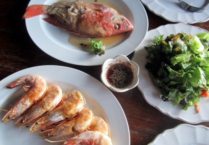 Tiistaina 8.5. meillä oli rantapäivä. Tosin vilkas sellainen. Minä maalasin ulkosalla, kävimme yhdessä hieronnassa ja teimme kaksi pitkää kävelyretkeä. Ensimmäinen oli maisemaretki, toinen ruokaretki. Tilasimme kokonaisen red snapperin grillattuna runsaan valkosipulin kera. Istuimme hiekkarannalle katetussa pöydässä, aallot löivät rantaan ja viimeiset auringonsäteet kultasivat taivaan. Siitä ei ruoka eikä tunnelma parane.