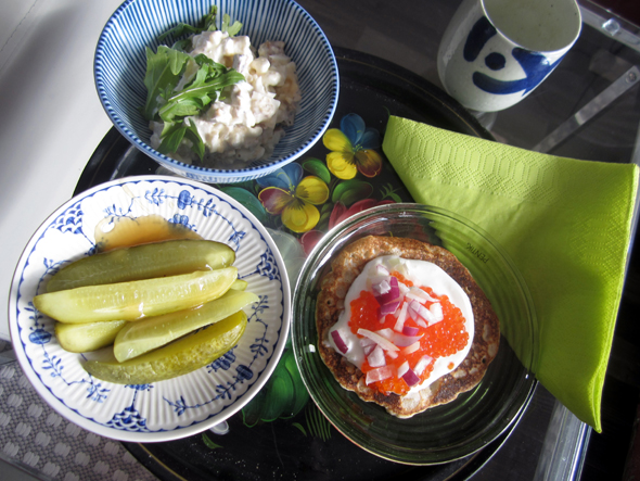 Sain pääsiäismaanantaina koko perheen koolle. Sen kunniaksi paistoin komean kasan blinejä – talviherkkua. Sain nuoruudessani kihlajaislahjaksi pienen valurautaisen blinipannun. Se on seurannut uskollisesti mukana muutosta toiseen. Vaikka vietin lähes tunnin keittiössä kuuman lieden äärellä, vaiva kannatti. Kaikki ähkivät tyytyväisinä viimeisten lettujen parissa.