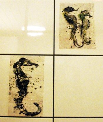 Nyt on toinen kurssiviikonloppu takana ja työt valmiina ripustukseen. Paitsi merihevoset, jotka tulostin muovikelmulle ja kiinnitin silmäniloksi suihkupullon avulla kylpyhuoneen kaakelilaatoille. Nimittäin kun kalvon kiinnittää, se ei lähde enää irti. Seuraava asukas saa todella persoonallisen ilmeen.