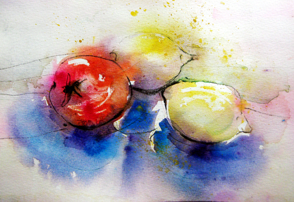 TOMAATTI JA KAKSI SITRUUNAA – akvarelli