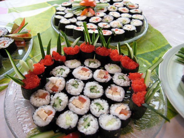 Kun sushit tulivat muotiin, niistä kehittyi meille uusi syntymäpäiväperinne. Minä keitän riisin ja nuoriso pyörittelee makirullat.