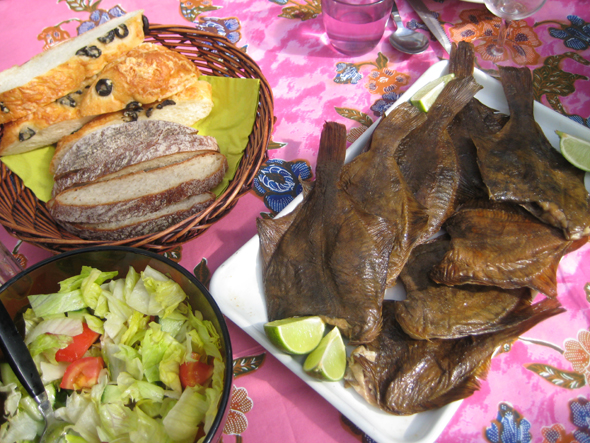 Kesäruokailu on siinäkin mielessä mukavaa, että sään salliessa Jussi puuhailee ulkogrillin äärellä. Mökkivieraiden kanssa teemme porukalla salaatit ja pesemme uudet perunat. Sitten onkin aika istahtaa ison pihapöydän äärelle nauttimaan kesäkeittiön herkuista. Yleensä siinä vierähtää melkoinen tovi. Juhlahetkinä Jussi hakee kitaran ja lauluvihot. Silloin kesänvietto on parhaimmillaan.