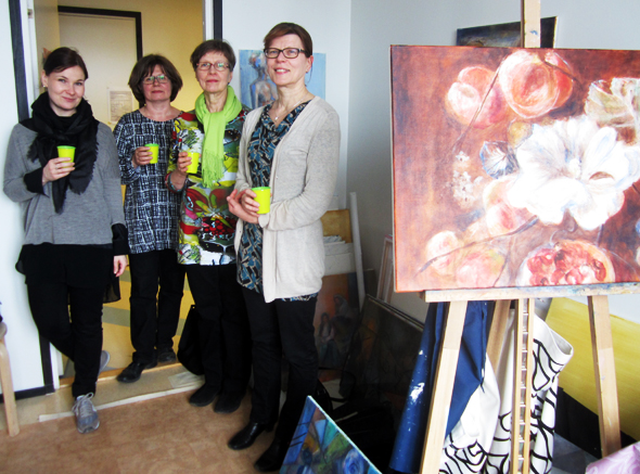 Vietimme iloisen taide- ja ruokailupäivän. Minulle kohokohta oli Vanajaveden Opiston näyttelyn ripustus. Arvelin selviäväni puolessa tunnissa. Onneksi ymmärsin pyytää Jussin avuksi. Niin siinä kävi, että minä jatkoin joukkueeni kanssa kierrosta ja miesparka jäi hommiin. Ei toden totta ole helppoa olla taiteilijan mies.
