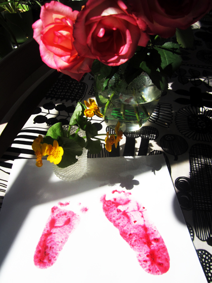 Sain äitienpäivän kunniaksi hurmaavan onnittelukortin. Samun ja Otson jalanjäljet on painettu puolukkahillolla. Kortin luovutus tapahtui pienellä viiveellä, koska maaliaineet kestivät kuivua. Kiitos-kiitos.