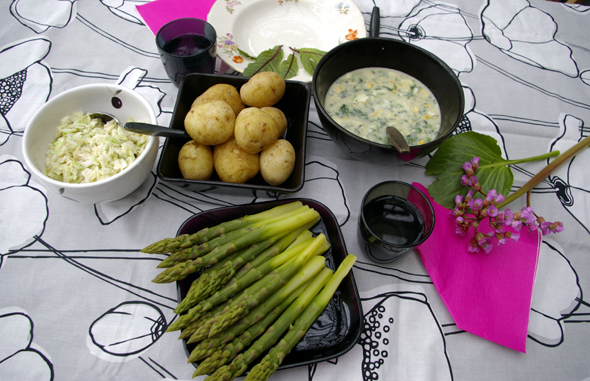 Kausiruuat ovat ihania. Mökin pihapiiristä löytyi terhakoita nokkosia. Tein valkokastikkeen ja lisäsin siihen kaksi keitettyä kananmunaa sekä ison nipun ryöpättyjä lehtiä. Vihreät parsat toivat kesän tuulahduksen. Lisänä oli uusia perunoita – ei kylläkään vielä kotimaisia – sekä varhaiskaalisalaattia. Maut sopivat hyvin yhteen. Kaikki olivat mietoja ja maukkaita.