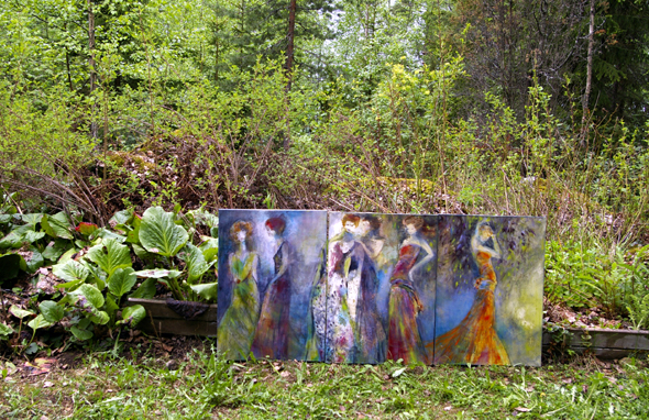 Ensimmäinen mökkiviikko on ollut kerrassaan mukava. Öljyvärimaalaus raikkaassa ulkoilmassa on ilo. Otin käyttöön talvella tekemäni puoliöljypohjat. Sivellin luisti ihan eri malliin, kuin gessopohjusteella. Maalasin triptyykin otsikolla Juhliin lähdössä. Minua viehättää nostalgiateema. Kyseessä on koulutyö. Sovelsin aihetta vapaasti.