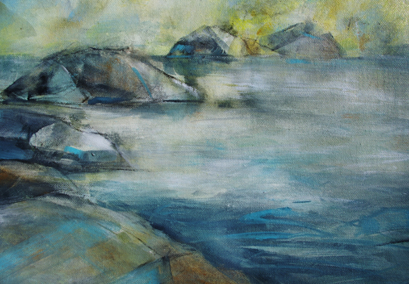 Ja toden totta, lauantaina aurinko paistoi pilvien lomasta. Minä pystytin leirin ystäväni Marin kanssa venepoukamaan. Sain päivän aikana valmiiksi kaksi maalausta. Tahti oli hyvä, sillä akryylivärit kuivuivat puuskaisessa tuulessa ennätysvauhtia. Pekka oli tyytyväinen kuviini, vaikka onkin itse enemmän näköistaiteen tekijä.