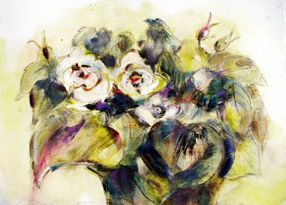 Juhannusviikko on edennyt sadepäivistä aurinkoiseen suuntaan. Mökkipihalla kukkivat juhannusruusut. Katselin kimppua ja harmittelin, ettei minulla ole matkassa akvarellivärejä. Kokeilin sitten, miten kukkamaalaus sujuu öljyväreillä. Sujuuhan se. Toivotan ruusujen myötä hyvää juhannusta kaikille ystäville.