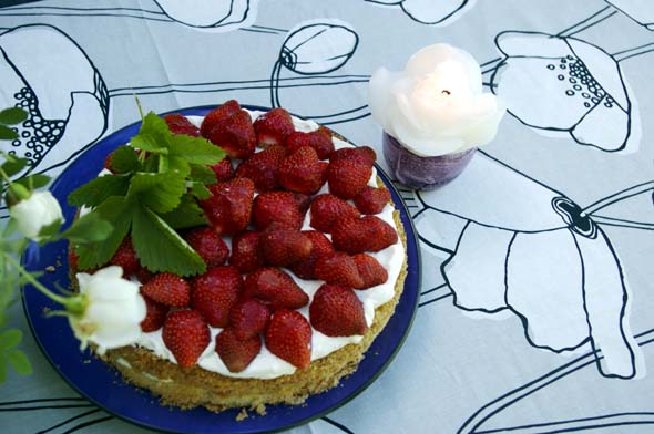 Juhannuksena käynnistyi grillauskausi. Ensimmäisenä kuumalle ritinällä päätyivät kasvikset – kesäkurpitsa, herkkusienet, paprika, tomaatit, nektariitit – sitten lihapihvit ja halloumijuusto. Kaiken herkuttelun päätteksi joimme päiväkahvit kesän ensimmäisen mansikkakakun kera. Sen täytteenä oli kuohukermaa, rahkaa ja mascarbonejuustoa.