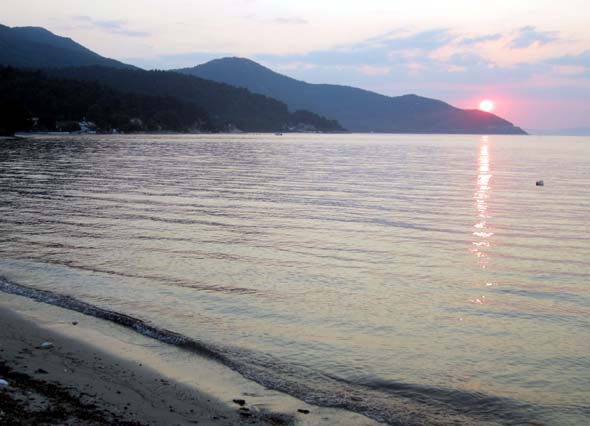 Pienen siestan jälkeen jaksoimme lähteä vielä kylälle illalliselle.  Mesoglios-ravintola rantakadulla sai meistä asiakkaat jo toisen kerran.  Liekö Aurinkomatkojen ilmaisilla viinikupongeille ollut jotain osaa päätökseen.  Tunnelmakin oli kohdallaan, sillä oli auringonlaskun aika.