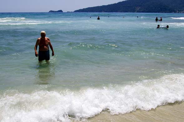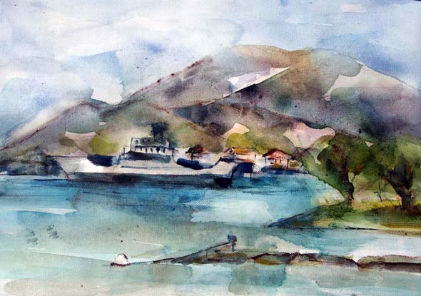 Minä perustin ateljeen rantapenkereelle ja maalasin viehättävää Limenasin poukamaa nyt vastakkaisesta suunnasta kuin eilen.  Komea harmaahiuksinen herrasmies jostain itäeuroopan maasta kävi katsastamassa töitäni.  Vaikka meillä ei ollut yhteistä kieltä, huomasin että hän piti niistä jopa niin paljon että tarjoutui maksamaan yhdestä 20 euroa.  Nauroin vaan enkä myynyt.  Osuisipa joskus kohdalle todellinen mesenaatti.
