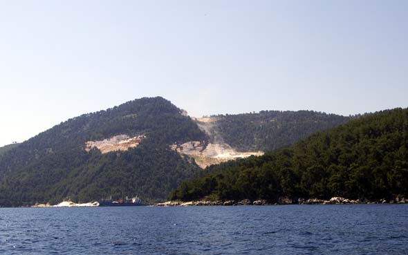 Näimme tien varressa hohtavia marmorilouhoksia.  ”Saaren vauraus perustuu matkailuun, oliiviöljyyn sekä valkoiseen marmoriin”, opastyttö kertoi.