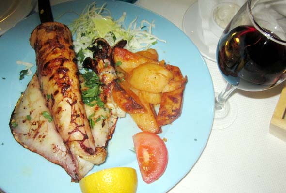 Tilasimme vihreää salaattia ja grillattua mustekalaa.  Annos oli valtava.  Jussi vetosi päivällä syömiinsä lihapulliin ja antoi minun selviytyä suurimmista lonkeroista.  Täällä joka ikinen ruokapaikka on tarjonnut ilmaisen jälkiruuan.  Olemme saaneet hedelmiä, suklaakakkua jäätelön kera, baklavaa ja tänään herkullista vaniljavanukasta hapankirsikoiden kera.  Hotellille päästyämme Jussi tarjoili meille yömyssyksi ouzot.  Rantaelämä on mukavaa.