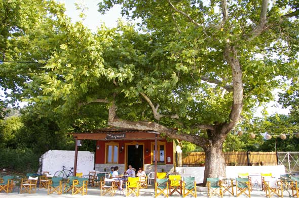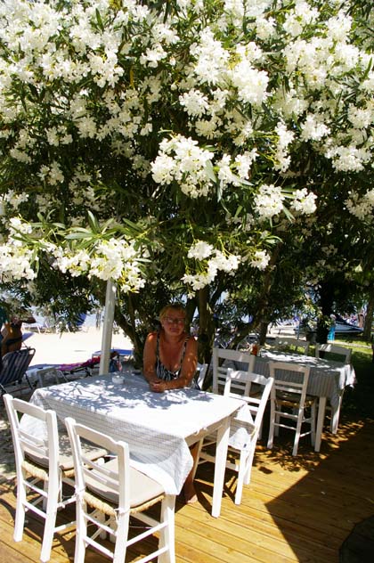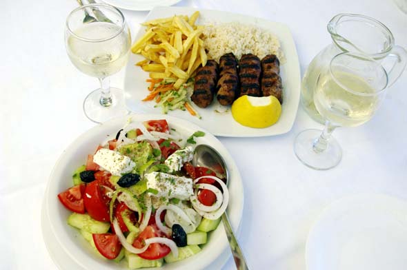 Me söimme siellä raikkaan lounaan, kreikkalaista salaattia ja zouzoukakia (=pitkulaisia lihapullia) kylmän valkoviinin kera.  Iltapäivä vierähti mukavan rennosti.  Kello oli kuusi, kun palasimme hotellille.  Nahkaa kuumotti, vaikka olimme suurimman osan päivästä oliivipuiden varjossa.