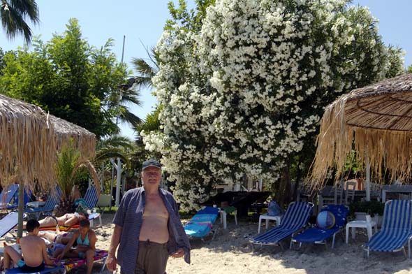 Pakkasimme matkaan uimapuvut, pyyhkeet, lukemista sekä akvarellivälineet.  Hotellin lähistöllä on kaksikin pientä hiekkarantaa.  Valitsimme Tarsanas-rannan, jossa rantatuolit olivat ylellisesti puutarhan keskellä.  Ne olivat vapaasti valittavissa, jos käytti viereisen tavernan palveluita.