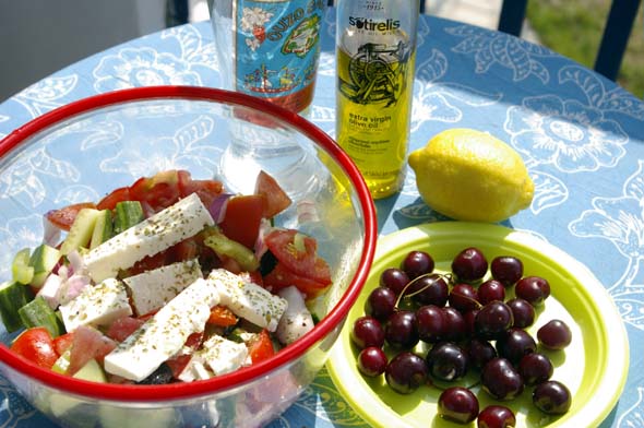 Miten tomaatit voivatkaan olla niin meheviä ja sipulit makeita. Söimme tavernoissa, mutta kokeilimme myös omatoimista kokkailua. Pienessä perhehotellissamme oli keittonurkkaus ja jääkaappi. Otsikkokuvassa on itse tehty kreikkalainen salaatti, joka maistui rantahiekalla kylmän valkoviinin kera kerrassaan herkulliselta.