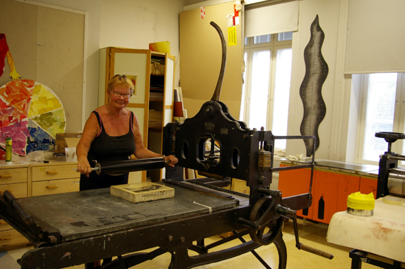 Hämeenlinnassa kaikki on mahdollista. Taiteilijaseuralla on komea antiikkinen litografiaprässi ja kunnioitettava kokoelma kiviä. Ne on sijoitettu verkatehtaalle kuvataidekoulun tiloihin. Nyt kesällä, kun koululaiset ovat lomalla, olen päässyt graafikkosiskojen kanssa kokeilemaan tätäkin menetelmää. Opettajani Petra näytti kädestä pitäen, miten homma aloitetaan hiomalla painavia kiviä vastakkain. Väliin suihkutetaan vettä ja carborundumhiekkaa.
