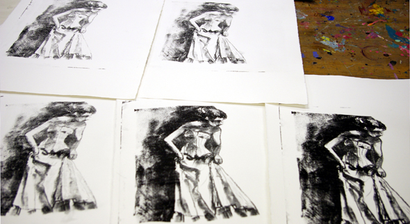 Saimme tehdä syövytyksen kolmeen kertaan, ennen kuin kuva suostui vedostettavaksi. Väri levitettiin hyvin kastellulle kivelle suurella telalla. Sain loppujen lopuksi tasan viiden kappaleen sarjan, sillä vedokset tummenivat kerta kerralta.
