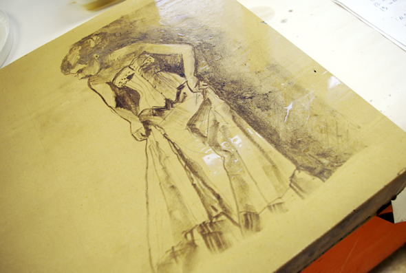 Näin pitkälle edistyimme ensimmäisellä oppitunnilla. Jatkoin tänään Petran kanssa harjoituksia. Kuvan syövyttäminen kiveen ei ollutkaan mikään läpihuutojuttu. Ohjekirjasessamme oli toistakymmentä kohtaa, jotka piti tehdä oikeassa järjestyksessä. Tarvitsimme ainakin seuraavia aineosasia: talkkia, arabikumia, typpihappoa, asfalttia, pesusieniä ja harsoa, lamppuöljyä. Välillä kuivattiin ja välillä kasteltiin.