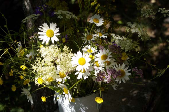 Mökin siivous innosti onnimietelmiin. Koska odottelemme pikkuväkeä kesävieraiksi, minä imuroin ja Jussi pesi juhlan kunniaksi lattiat. Kävin keräämässä kimpun kesäkukkia pihakeinulle.