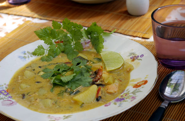 Anna ja pikku Samu saapuivat yllätysvierailulle mökille. ”Laita jotain hyvää”, tytär pyysi, kun kyselin mitä hän haluaa mökkiruuaksi. Minun bravuurini on thaikalakeitto. Niinpä kippasin kookosmaitotölkin kattilaan ja lisäsin siihen pari ruokalusikallista masamancurrytahnaa (Koh Samuilta Nathonin Tescon tuoretiskiltä), tuoretta valkosipulia ja inkivääriä, kuivattua chiliä sekä sitruunaruohoa (pakasteesta).