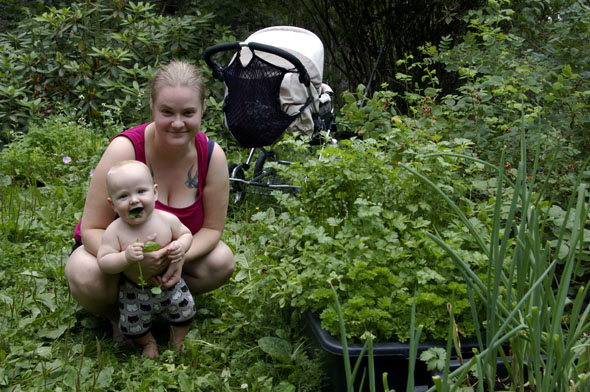 Seuraavaksi pataan pääsivät kuivatut suppilovahverot, perunakuutiot sekä iso punasipuli. Kun ne olivat kypsiä, lisäsin kirjolohikuutiot sekä tähteeksi jääneet grillikasvikset. Maustoin keiton soijalla, pippurilla, tillillä, vihreillä sipulinvarsilla, limetinmehulla sekä tuoreyrteillä. Kotipihasta löytyi sekä thaibasilikaa että tuoksuvaa korianteria. Anna kommentoi, että hyvältä maistui.
