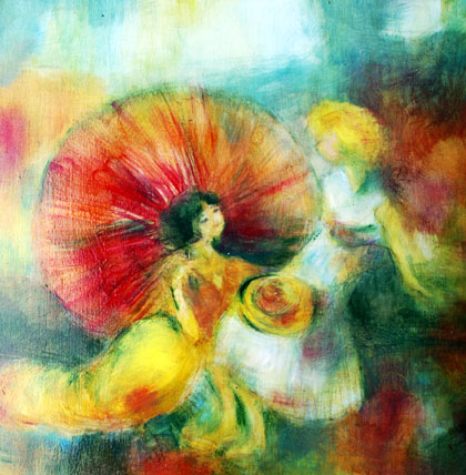 Kesätehtävien aiheina on luonto sekä ilo. Maalasin kesäkuussa Aulangolla taiteilijaseuran kurssilla luontoa. Iloaihe on mieleinen, sillä sen voi tulkita jälleen kerran mukavan vapaasti. Minulla on tekeillä neljä iloista öljyvärimaalausta.
