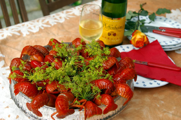 Parin päivän sateen jälkeen oli ilo istua illanhämyssä ulkona. Tarkenimme, sillä infrapunalämmitin säteili kilpaa kynttilöiden kanssa. Ravut maistuivat kaikille. Voin vakuuttaa että ne todellakin olivat aitoja kotimaisia. Olin soutamassa useana iltana, kun Jussi laski merrat omaan rantaan. Keitimme 24 vonkaletta kahdessa erässä. Keitinveden maustoimme runsaalla merisuolalla ja runsaalla tillillä. Asetin ne tarjolle perintovadille, jota käytämme tasan kerran vuodessa – rapujuhlissa.