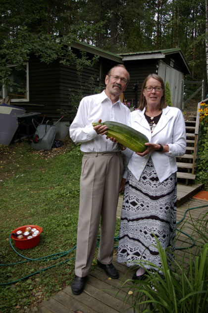 Ystävämme Lii ja Kaizu saapuivat oikein juhlavaatteissa mökille rapujuhliin. No, outo valinta mökkiasuksi johtui siitä, että he tulivat suoraan häistä. Tuliaisina heillä oli saalista Huizin mökin kasvimaalta. Kesäkurpitsa oli ehtinyt kasvaa jo porsaan mittoihin. Sain myös tuoretta minttua, jota tilasin taboulehia varten. Omalta kasvimaalta löytyy muut tarvittavat yrtit.