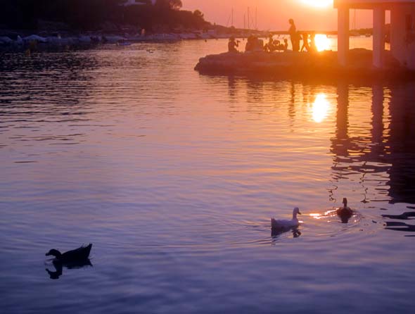 Auringonlasku näkyi punaisena pallona lähirannallemme. Ankkaparvi pulikoi rantavedessä. Ilta pimeni sen jälkeen nopeasti. Hotellin sisäpihalle oli sytytetty satoja tuikkuja valkoisten paperipussien sisään. Ilta oli pehmeän lämmin ja vieno merituuli hiveli ihoa. Jussi luki jostain, että täällä on aurinkoisia päiviä 300 vuodessa. Olisipa meilläkin.
