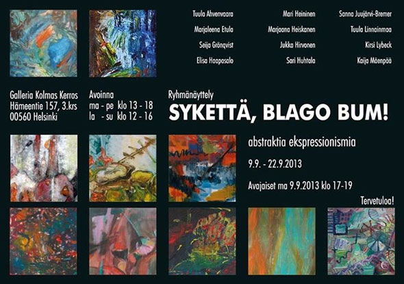 Kummallinen näyttelyn nimi juontaa juurensa koulutehtävästä. Aiheena oli abstrakti ekspressionismi. Virittäydyimme teemaan lukemalla kukin vuorollamme foneettisen runon, jossa ei ollut päätä ei häntää, rytmi vain. Sen innoittamana sitten maalasimme.