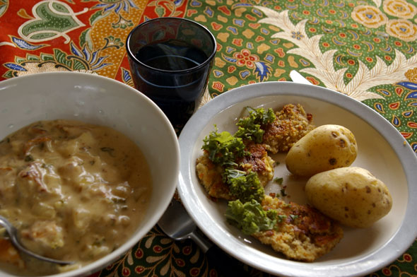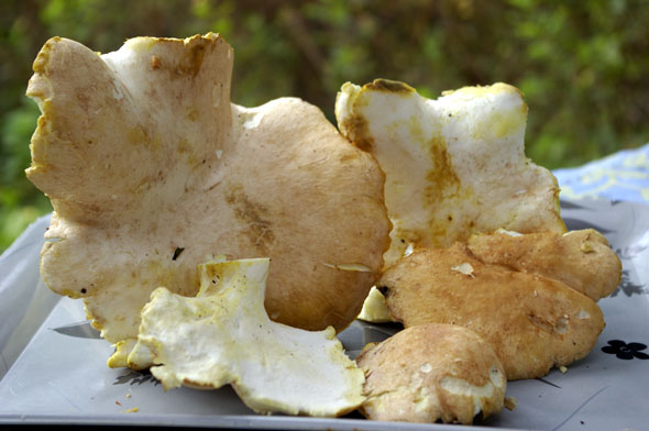 Jussi paistoi meille komeat pihvit lakeista. Hän kastoi sienet kananmunaan ja leivitti sen jälkeen kevyesti korppujauhoilla. Makuelämys oli pähkinäisen raikas. Koska sieniä oli ylenpalttisesti, tein pihveille seuraksi kantarellikastikkeen. Pelkkä valkokastike olisi riittänyt, mutta hyvältä sienet maistuivat sienten kera.