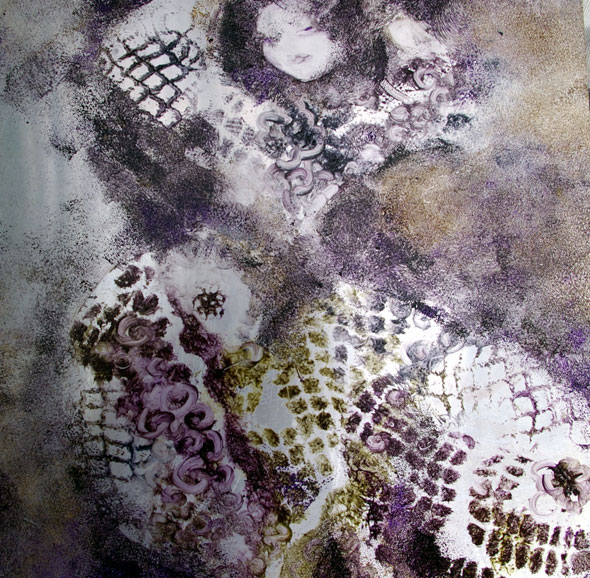 Maalasin offsetpellille öljyväreillä otsikkokuvan tanssijan. Kokeilin, miten pitsi sopii sabluunaksi. Aikaisemmin olen käyttänyt sitä menestyksekkäästi sekä akvarelleihin että grafiikkatöihin. Ja toimihan se paksullakin maalilla. Pellinpalaseni ovat pieniä. Jos jatkan samaan malliin, en todellakaan tiedä, miten isot ohuet alumiinilevyt voisi laittaa ripustusvalmiiksi. Ehkäpä kätevä Jussi keksii.