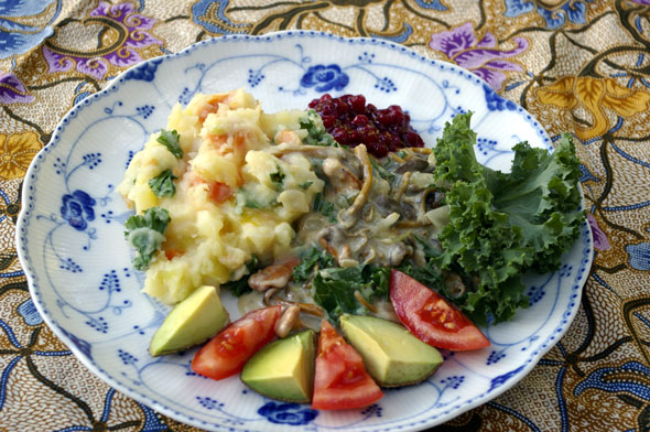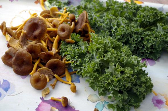 Laitoin perunat kiehumaan ja pinkaisin poimimaan suppilovahveroita. Herkullinen sieniherkku valmistui käden käänteessä. Käytin sienet pannulla, lisäsin voita ja sipulia sekä ruokakermaa. Keräsin viikonloppuna Lauran ja Miikan kasvimaalta tuoreita lehtikaaleja. Niinpä värikäs lounas oli ilo sekä silmille että makuhermoille.