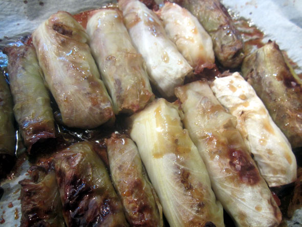 Illalla perkasimme sienisaaliin ja minä paistelin blinejä. Sunnuntaiaamun brunssin jälkeen keittiössä tuoksuivat kaalikääryleet. Olin vaipua epätoivoon, kun käärin niitä kasaan ennen vieraiden tuloa. Kaalinlehdet eivät suostuneet ollenkaan yhteistyöhön. Lopputulos oli vähemmän esteettinen, mutta maku oli kohdallaan.