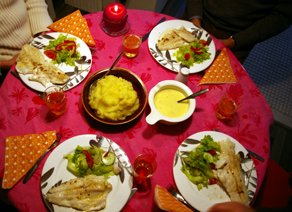 Vietimme teatteriviikonloppua ystäviemme Liin ja Kaizun kanssa Hämeenlinnassa. Panostimme Jussin kanssa kulttuurin lisäksi herkkuruokiin. Se oli helppoa, sillä Vanajaveden tuoretta kuhaa oli vielä jäljellä. Jussi grillasi fileet uunigrillillä runsaan valkosipuliöljyn kera. Minä valmistin hapokkaan kastikkeen kalaliemen, valkoviinin ja ruokakerman kera. Salaatti ja perunamuhennos täydensivät aterian.