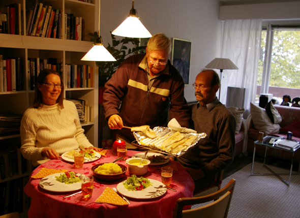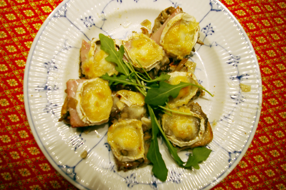 Tarjosimme ennen teatteriesitystä ”Pojat” kuohuviinit ja annokset katkarapusalaattia sekä graavia lohta tuoreen patongin kera. Yöhiukopalaksi kuumensimme grillillä suppilovahverokastikkeella ja juustolla täytettyjä paahtoleipiä. Jussi kokeili, miltä pienet vuohenjuustoleipäset maistuisivat. Hyviltähän ne.