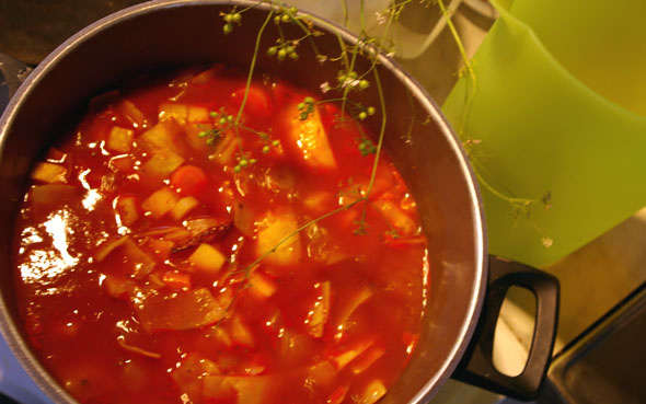 Kaalin lisäksi ainesosasia ovat sipuli, purjo, selleri, palsternakka, pari porkkanaa sekä suppilovahveroita. Liemenä on vesi ja tölkillinen paseerattuja tomaatteja. Mausteina yrttejä, soijaa, sitruunapippuria ja yksi kuivattu chili antamassa makua. Näillä eväillä mennään nyt pari-kolme päivää.