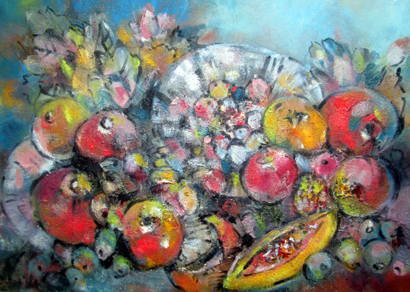 Minulla on meneillään hedelmäkausi. Ehkäpä siksi, että koko syksy on ollut sadonkorjuuaikaa. Maalasin nyt – kerrankin – paksuilla öljyväreillä, vaikka olin jo kerran luopunut koko ajatuksesta. Koska kaipasin työhön selkeyttävää viivaa, kokeilin onnistuuko tussi tarttumaan öljyn päälle. Tarttuihan se, kun lorautin sekaan dammarvernissaa.