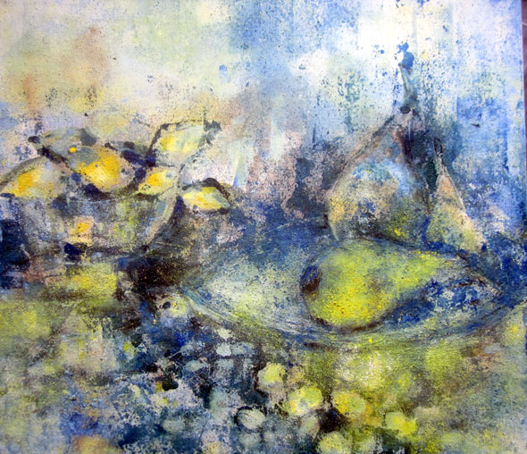 Kolmas temperamaalauskerta toi mukanaan uuden värin, ultramariininsinisen. Nyt sain huomata konkreettisesti, miten sävykkäitä vihreitä saa, kun itse sekoittaa värit. Pelkistin edellistä aihetta, mutta päärynät säilyivät. Omenat vaihtuivat sitruunoihin – kiitos keltaisen värin. Ensi kerralla pääsemme punaisen makuun.