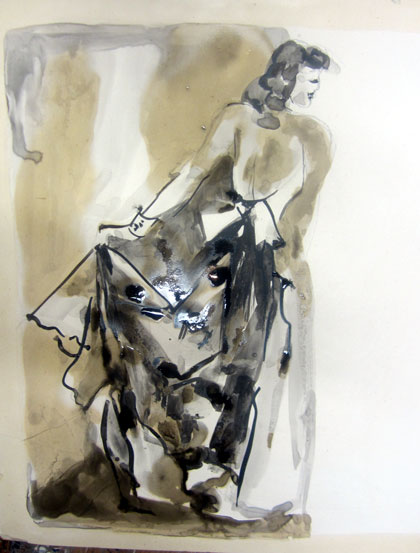 Pääsin jo toisen kerran opiskelemaan litografian saloja. Nyt kokeilin, miten tussilla maalaaminen toimii. Yhdessä illassa ei ehdi paljoa. Tähän mennessä olen hionut kiven, pohjustanut sen alunalla ja sivellyt reunat arabikumilla. Tänään valmistui piirros. Seuraavalla kerralla pääsen – toivottovasti – jo vedostamaan.