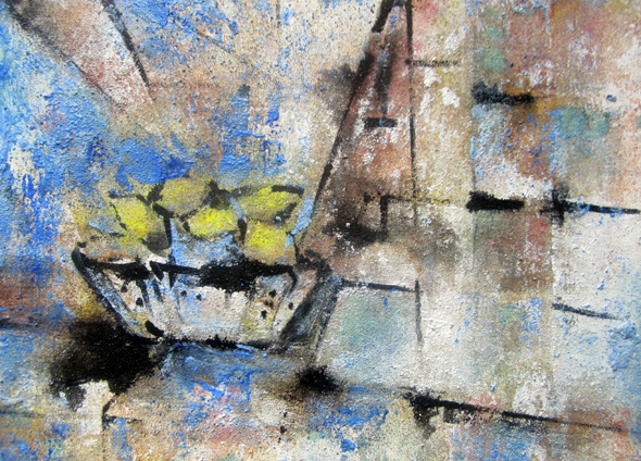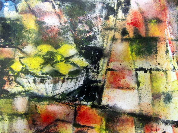 Temperakurssimme on edennyt jo neljänteen opetuskertaan. Nyt käytössä olivat pigmentit keltainen, sininen, punainen ja tehostevärinä musta. Valkoinen oli kielletty. Kurinalainen työskentely sopii minulle. Silloin keskittyy sallittujen värien mahdollisuuksiin.