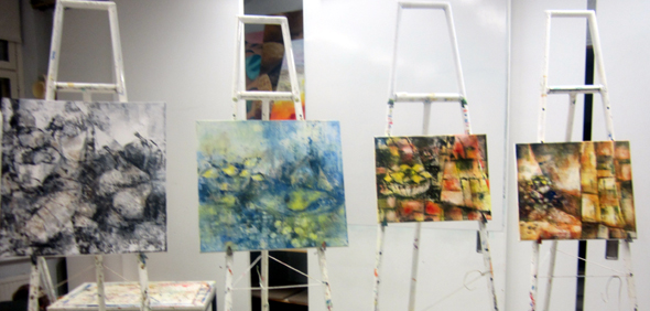 Sarjan viimeisimmässä työssä saimme käyttää päävärejä. Siis sinistä, punaista ja keltaista. Musta ja valkoinen oli kielletty. Katselmuksessa hämmästelimme, miten ensimmäiset maalaukset, jotka teimme tosi niukalla väriskaalalla, olivat kaikkein mielenkiintoisimmat. Pitäisiköhän tästä oppia jotain.