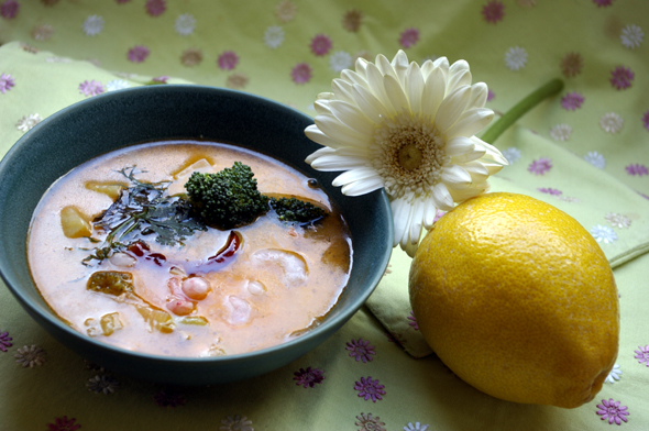 Keittelin kunnon kalaliemen perskeistä, jotka jäivät jogurttikalasta. Siivilöin ja lisäsin kattilaan purkillisen kookosmaitoa, limetinlehtiä sekä sitruunaruohoa ja kuivatun chilin. Kypsensin liemessä muutaman perunalohkon, runsaasti sipulia ja purjoa sekä parsakaalin varret. Lisäsin lopuksi parsakaalin nuput ja jäiset katkaravut. Maustoin keiton soijalla, valkosipulilla, sitruunapippurilla ja sitruunanmehulla sekä tietysti korianterilla. Harmittelin, että korianterin juuret jäivät mökin pakastimeen. Mikähän siinä on, että useimmiten kaikki tarpeellinen on väärässä paikassa. Hapokkuus ja tuliset mausteet tekevät keitosta herkullisen.